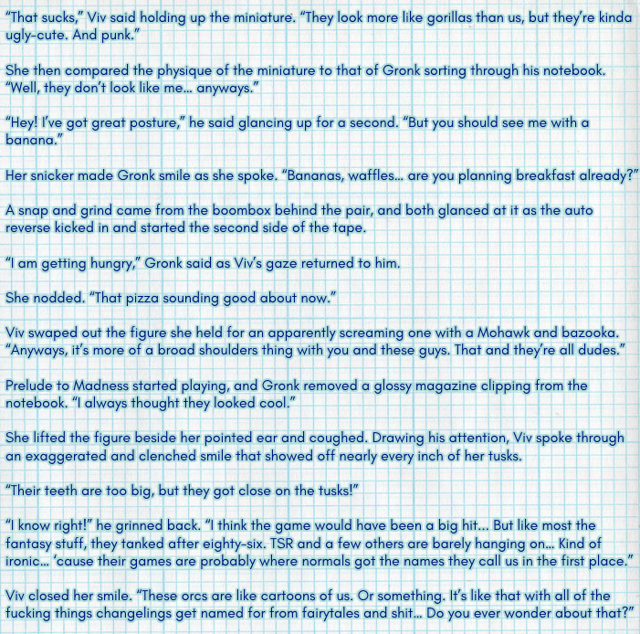 And now to skip ahead for another snippet, this time from chapter eight. It’s an important chapter that, among other things, shows us more of the world Viv and Gronk live as they talk about D&D, dimebags and what it is to be a changeling in 1989…