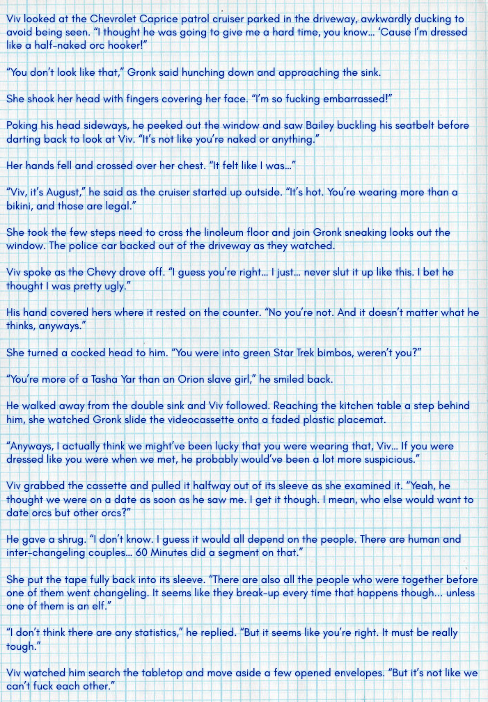 It begins with our teenaged orcs peering out the kitchen window at a local policeman in the driveway. Why was he there? Oh boy… you’ll just need to read the book when it’s done…