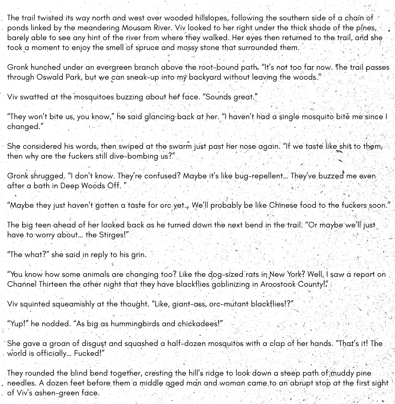 One of those good ideas I had involved the mechanics of how my orcish protagonists’ nightvision works. It’s not a huge revelation, but it has become minor plot point adding some detail and occasional challenge for them starting in chapter twelve. Not surprisingly, the climax of the story takes place at night, making this pretty relevant. ;-)