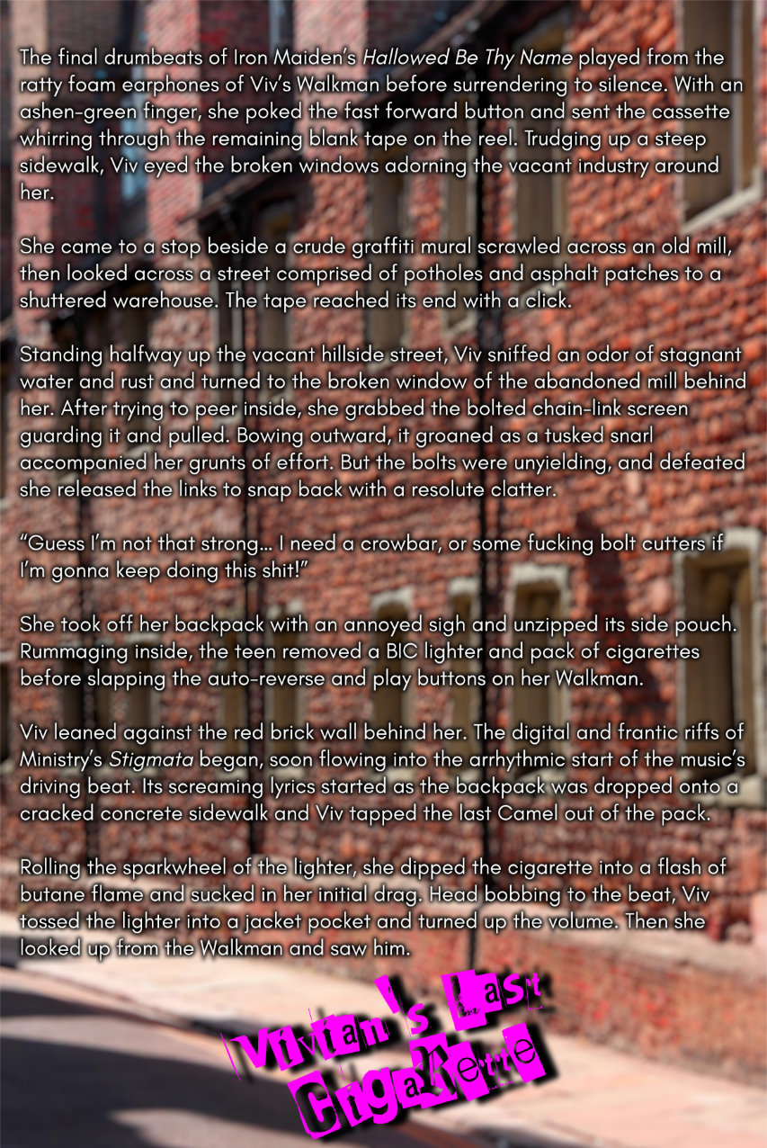 I’m really happy with this revision of the first chapter. I think it flows much better than the third did, and I’ve ironed-out a number of snags that had been hiding in it since the first draft. In hindsight I think these snags are narrative holdovers caused by the fact that when I originally started writing Vivian’s, I did so thinking it would be a short story.