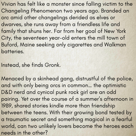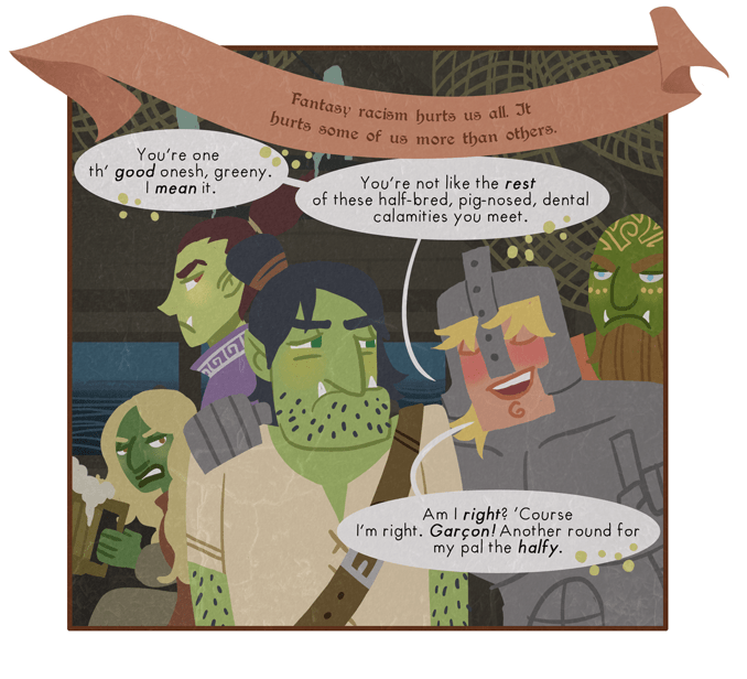 The big guy is, of course, too good natured to do anything but get emotionally bruised and quiet. But Viv silently witnesses his rejection. Having been an orc longer than Gronk, she’s grown thick-skinned and canny in dealing and (particularly) avoiding a world that usually sees her as a monster. But writing her reaction to seeing Gronk go through rejection like she did in the past was a good scene.