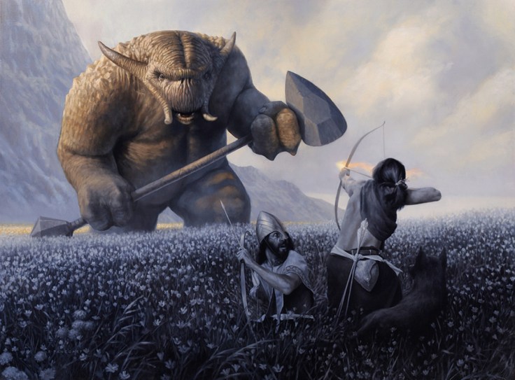 Really, really love this one. I like the monochromatic composition (I have a soft spot for monochrome) and the opposition between the unknown beast and the family.