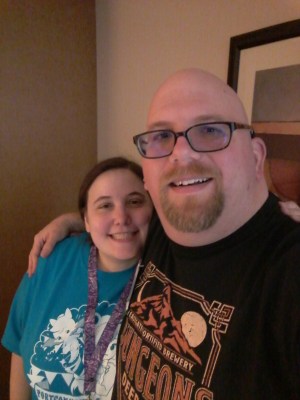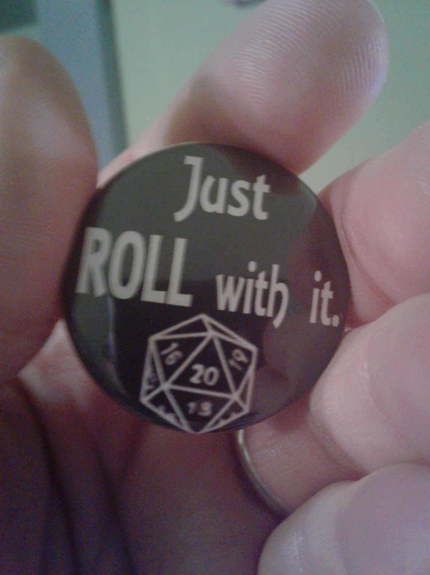 I finished my shopping with a stop at artist Melissa McCommon’s booth. Melissa is the creator of the Epic Chaos! webomic, and we had a nice conversation. She’s really talented, and had come all the way from California to Maine to vend at PortCon while visiting family… on her birthday! And she also had these awesome fantasy, RPG-ish buttons that I just had to add to my collection!