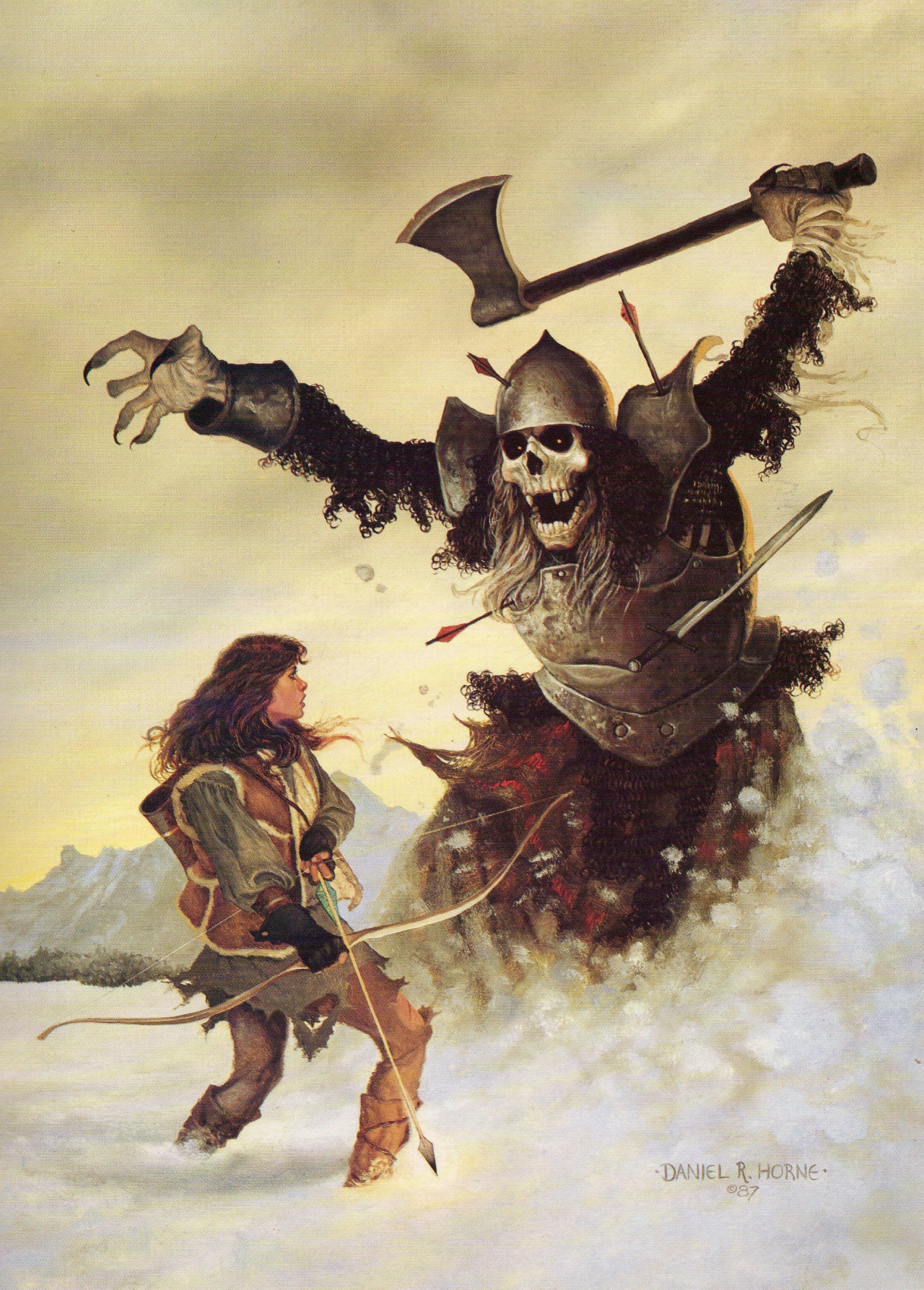 Back in the day, Dragon had a excellent track record for Halloween (and April’s Fools) themed covers, and this piece was no exception. It’s got great composition: The figure of the undead giant bursting through the snow is full of threat and movement, and the ranger’s pose with her bow is both desperate and determined at the same time.