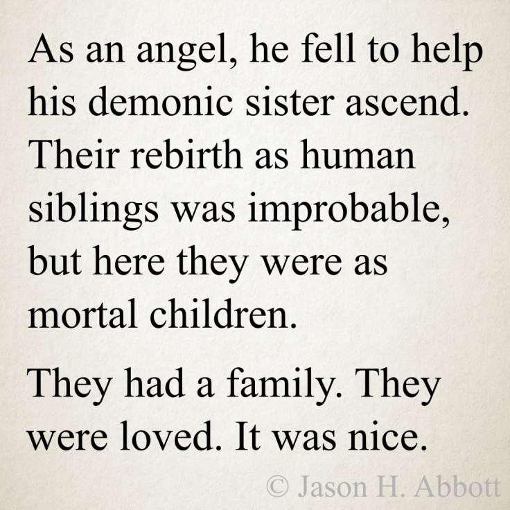 Mid-Week Muses: “An hour, huh? Can you make it two?” A weekly compilation of collected microfictions composed by yours truly. If your time is short, these are shorter! Copyright © 2017 by Jason H. Abbott, All Rights Reserved. Share this: Click to share on X (Opens in new window) X Click to share on Facebook (Opens in new window) Facebook Click to share on Pinterest (Opens in new window) Pinterest Click to share on Tumblr (Opens in new window) Tumblr Click to share on Reddit (Opens in new window) Reddit Click to share on Stumble Me (Opens in new window) Stumble Me Click to email a link to a friend (Opens in new window) Email Like Loading... Related Leave a comment Cancel reply Δ This site uses Akismet to reduce spam. Learn how your comment data is processed.