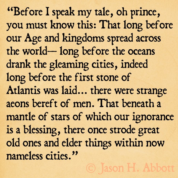 I’m rather happy that I was able to work “strange aeons” in as the hinge of my epigraph’s transition. Overall, I think it works as a mixture of the authors styles, although the tone leans slightly more towards Howard.