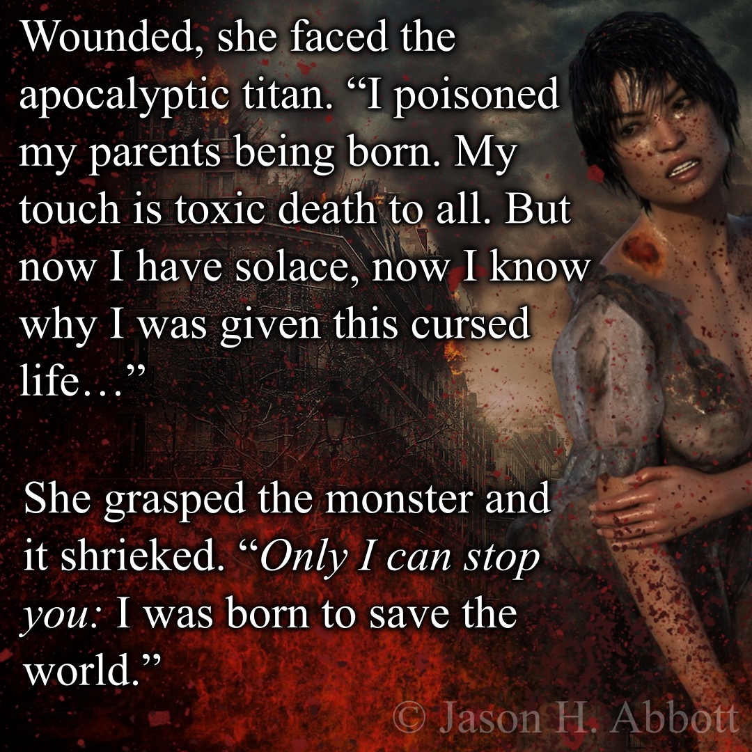 Wounded, she faced the apocalyptic titan. “I poisoned my parents being born. My touch is toxic death to all. But now I have solace, now I know why I was given this cursed life…”