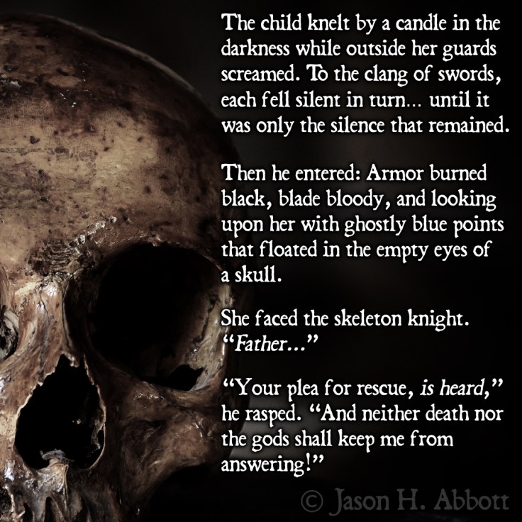 Then he entered: Armor burned black, blade bloody, and looking upon her with ghostly blue points that floated in the empty eyes of a skull.