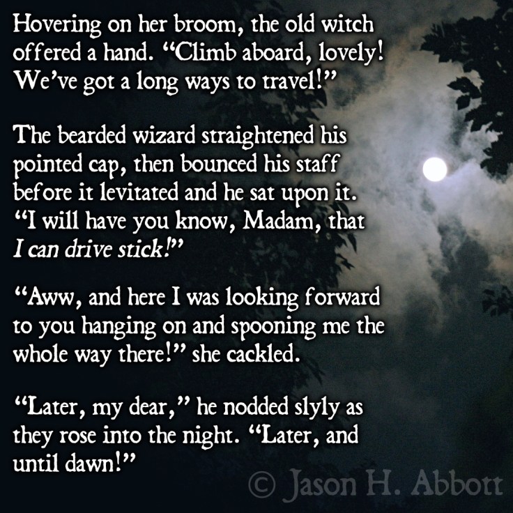 Hovering on her broom, the old witch offered a hand. “Climb aboard, lovely! We’ve got a long ways to travel!”