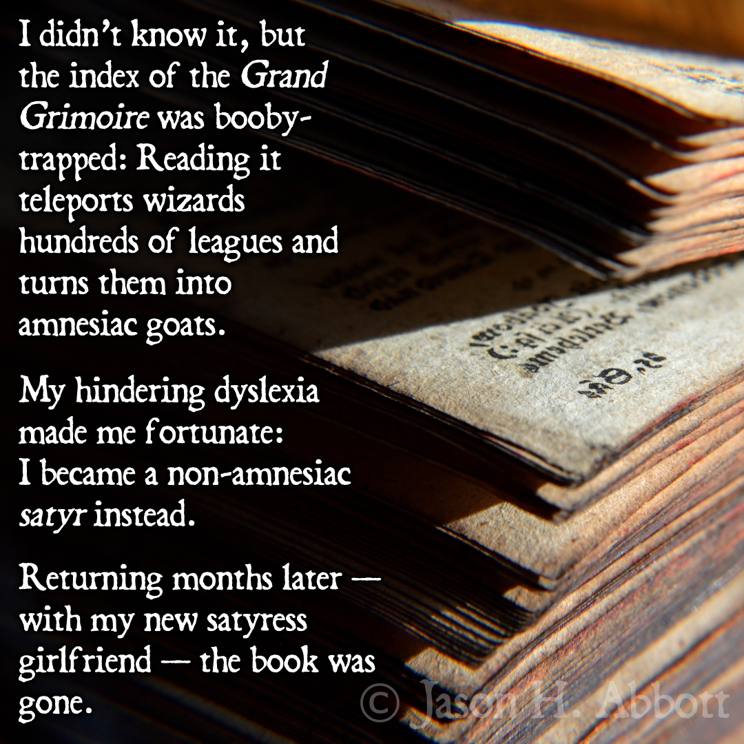 I didn’t know it, but the index of the Grand Grimoire was booby-trapped: Reading it teleports wizards hundreds of leagues and turns them into amnesiac goats.