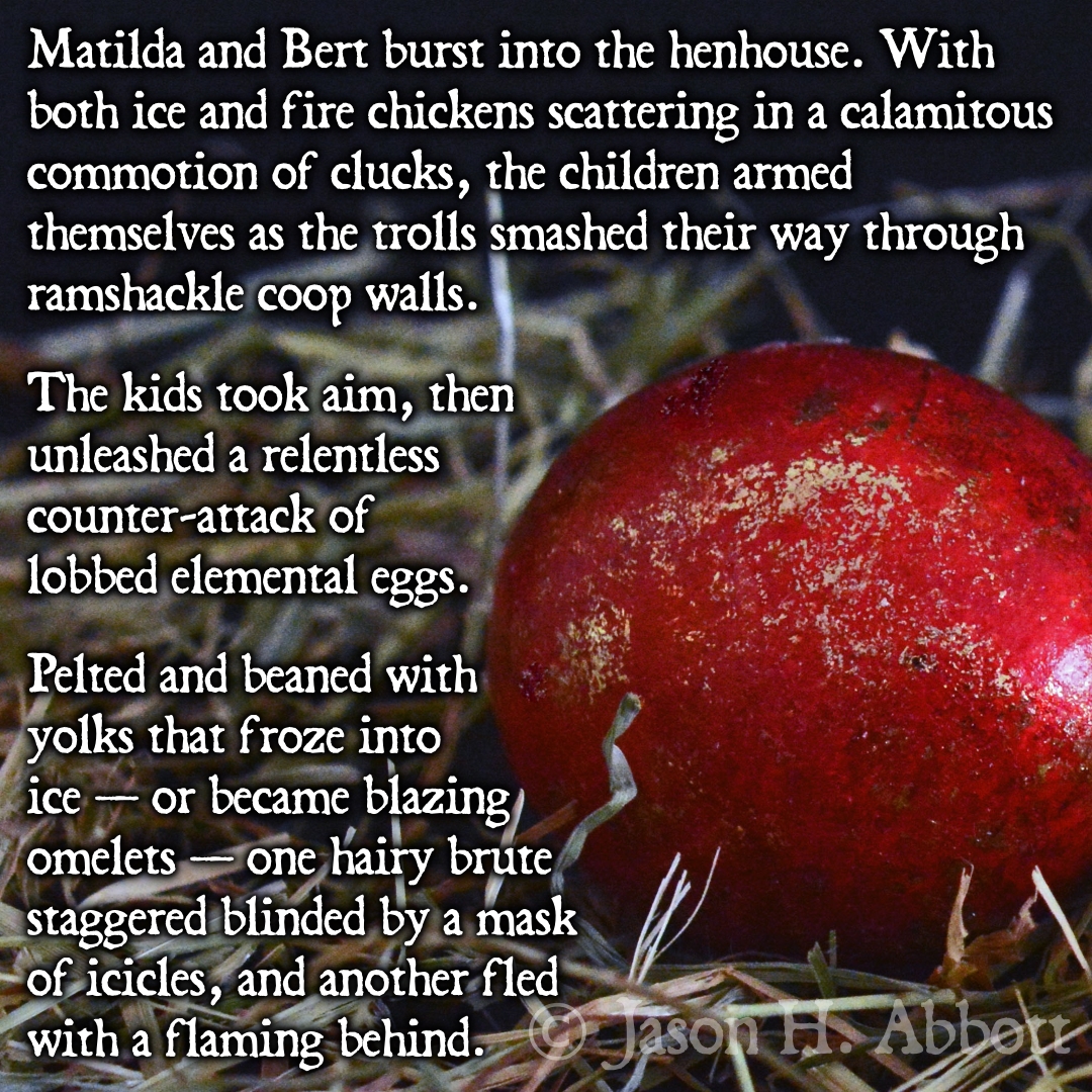 Matilda and Bert burst into the henhouse. With both ice and fire chickens scattering in a calamitous commotion of clucks, the children armed themselves as the trolls smashed their way through ramshackle coop walls.