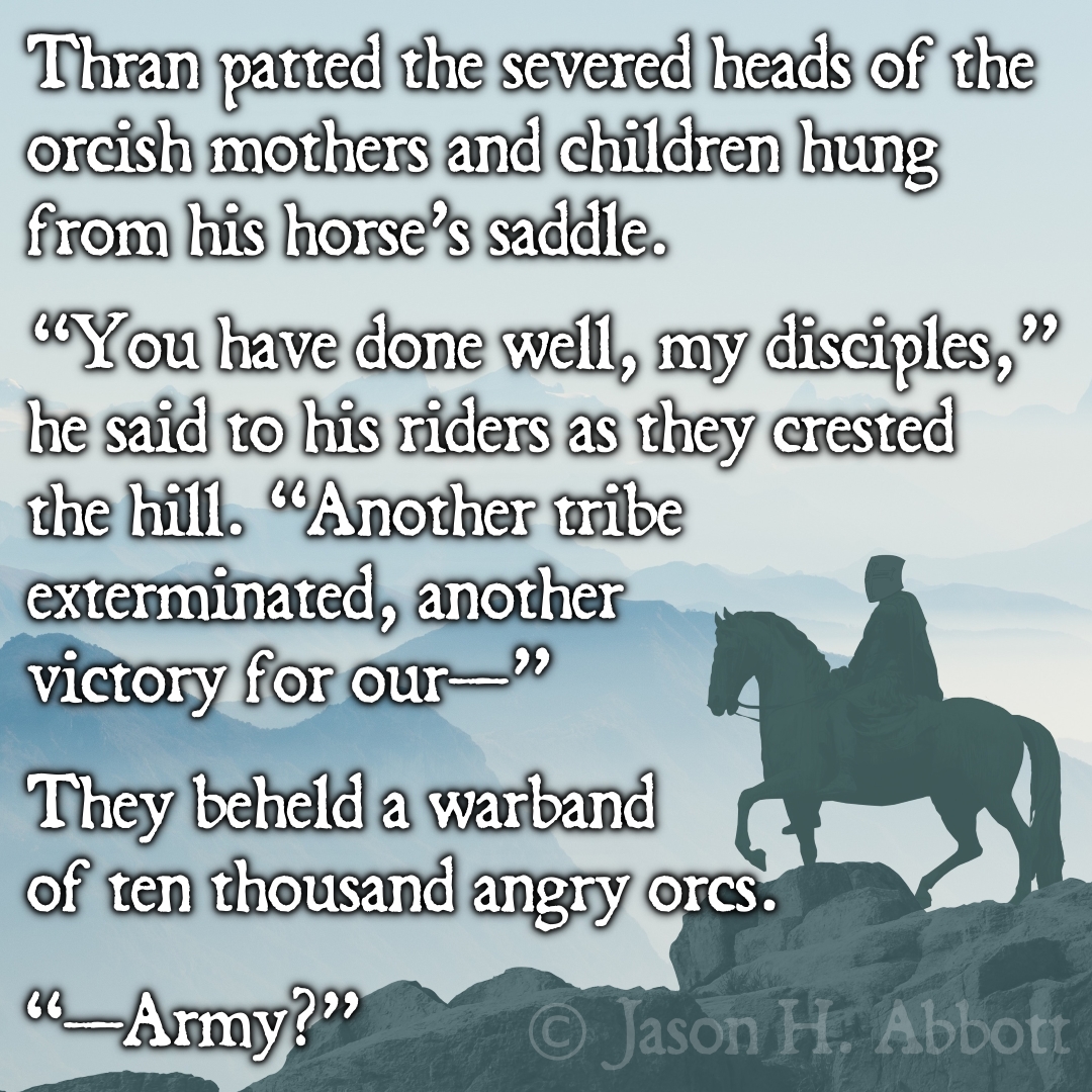 Thran patted the severed heads of the orcish mothers and children hung from his horse’s saddle.