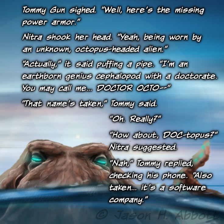 “Actually,” it said puffing a pipe. “I’m an earthborn genius cephalopod with a doctorate. You may call me… DOCTOR OCTO—”