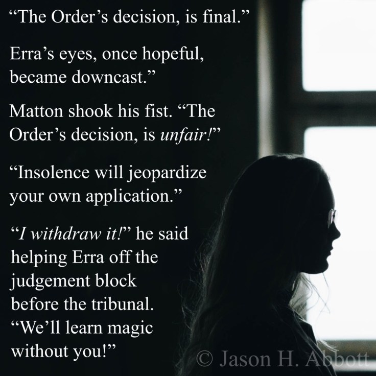 “I withdraw it!” he said helping Erra off the judgement block before the tribunal. “We’ll learn magic without you!”