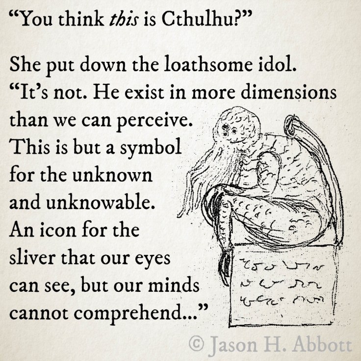 She put down the loathsome idol. “It’s not. He exist in more dimensions than we can perceive. This is but a symbol for the unknown and unknowable. An icon for the sliver that our eyes can see, but our minds cannot comprehend…”
