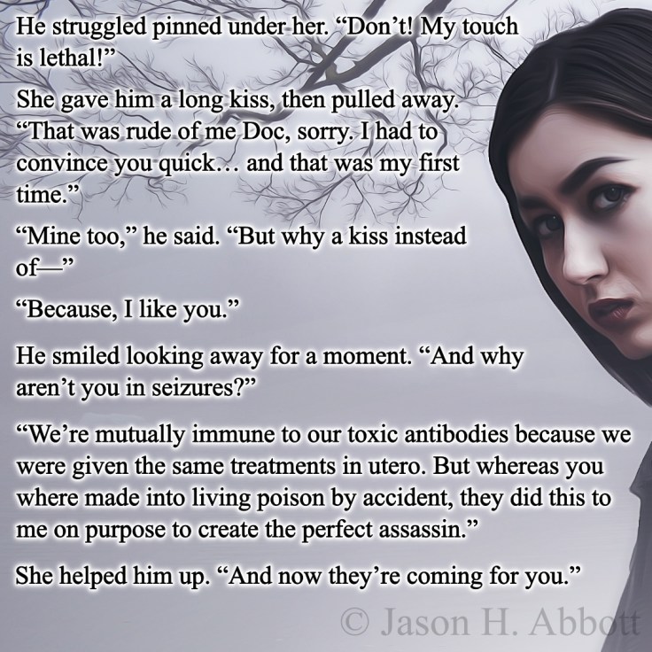 “We’re mutually immune to our toxic antibodies because we were given the same treatments in utero. But whereas you where made into living poison by accident, they did this to me on purpose to create the perfect assassin.”
