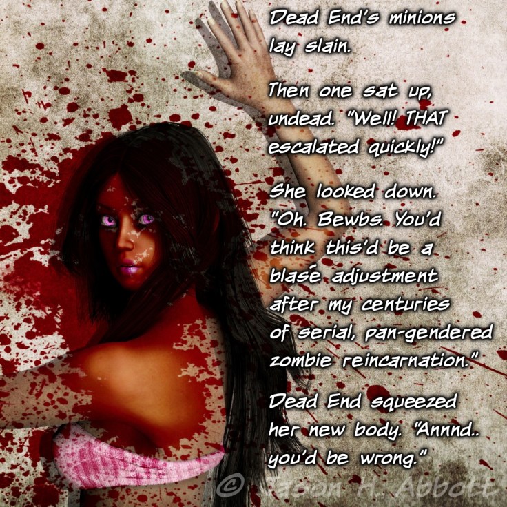 She looked down. “Oh. Bewbs. You’d think this’d be a blasé adjustment after my centuries of serial, pan-gendered zombie reincarnation.”