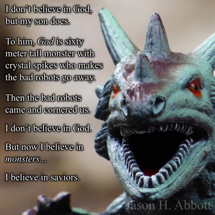 To him, God is sixty meter tall monster with crystal spikes who makes the bad robots go away.