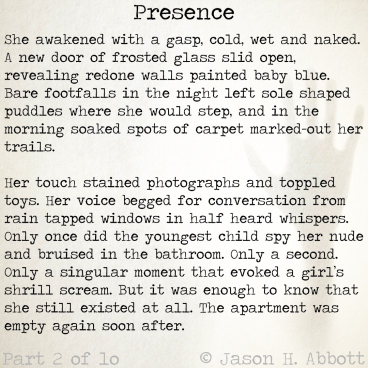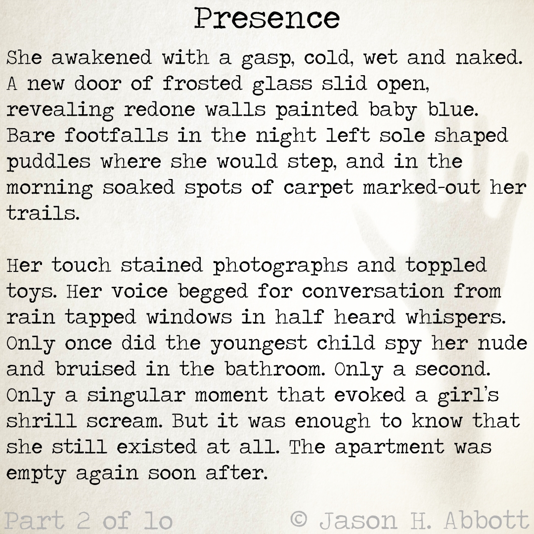 Her touch stained photographs and toppled toys. Her voice begged for conversation from rain tapped windows in half heard whispers. Only once did the youngest child spy her nude and bruised in the bathroom. Only a second. Only a singular moment that evoked a girl’s shrill scream. But it was enough to know that she still existed at all. The apartment was empty again soon after.