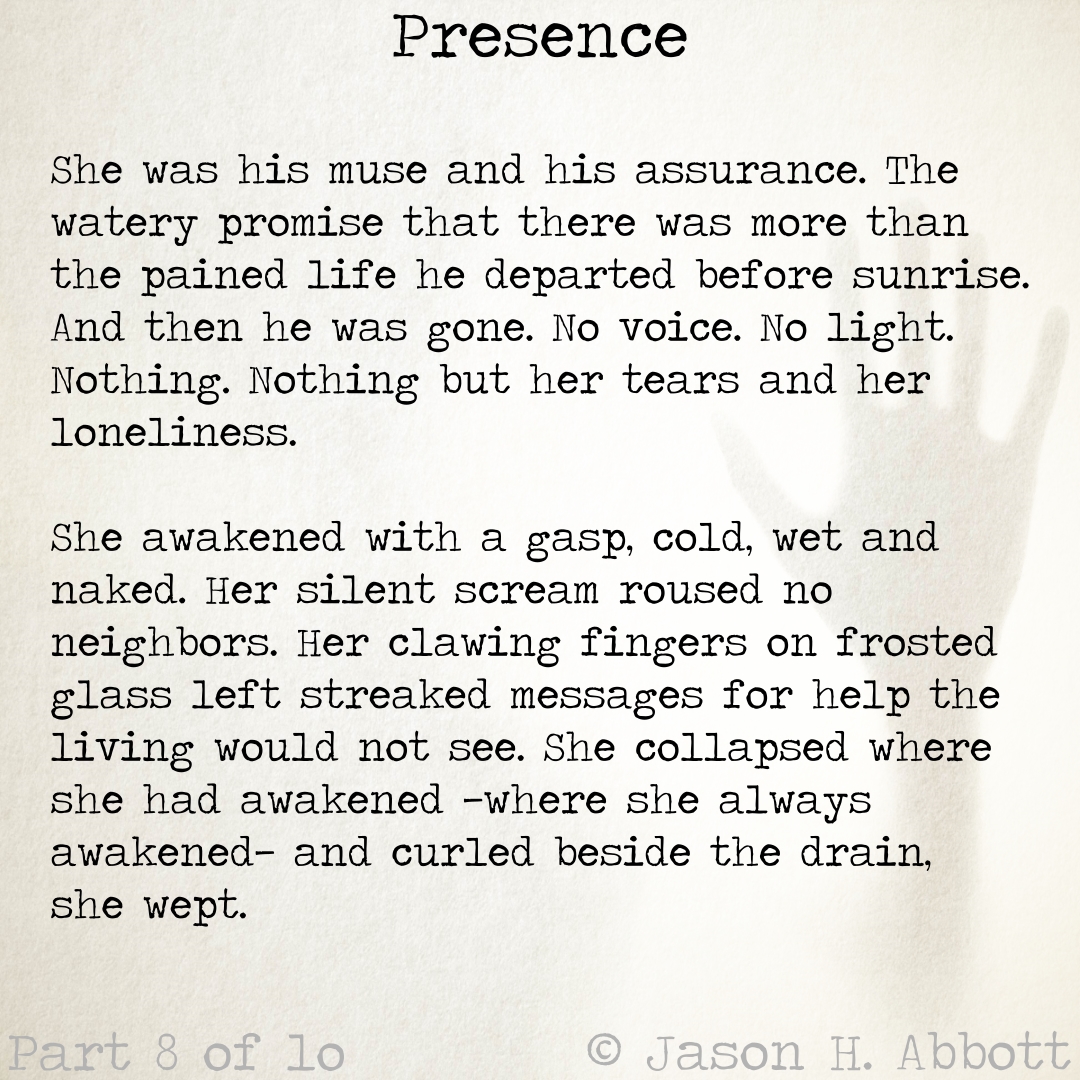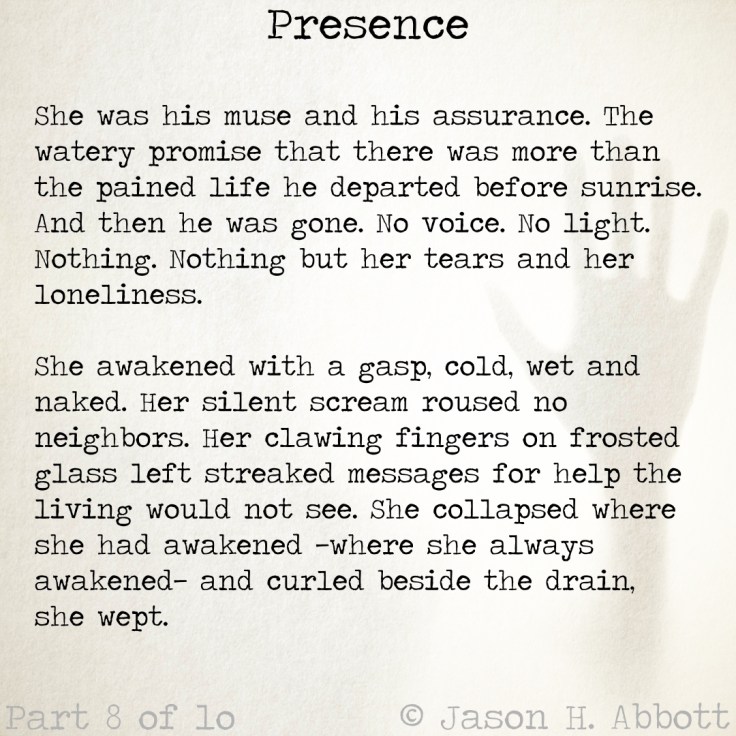 She awakened with a gasp, cold, wet and naked. Her silent scream roused no neighbors. Her clawing fingers on frosted glass left streaked messages for help the living would not see. She collapsed where she had awakened —where she always awakened— and curled beside the drain, she wept.