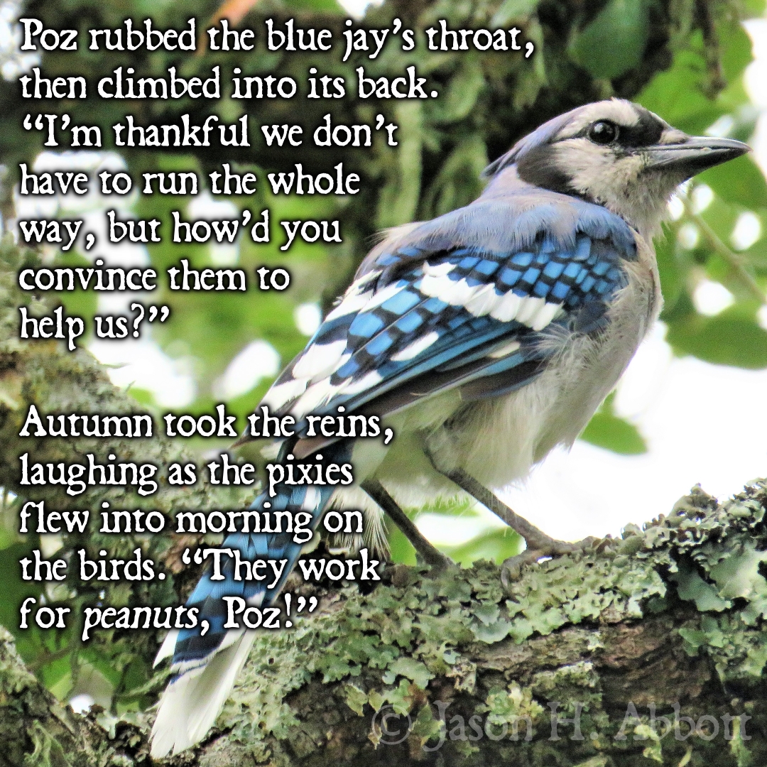 Poz rubbed the blue jay’s throat, then climbed into its back. “I’m thankful we don’t have to run the whole way, but how’d you convince them to help us?”