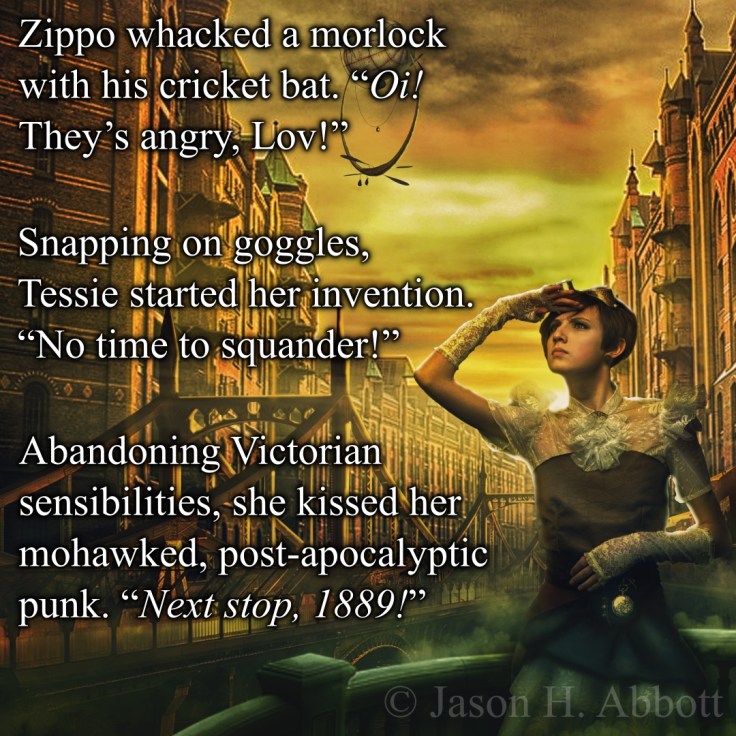Abandoning Victorian sensibilities, she kissed her mohawked, post-apocalyptic punk. “Next stop, 1889!”