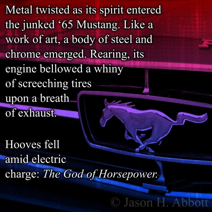 Metal twisted as its spirit entered the junked ‘65 Mustang. Like a work of art, a body of steel and chrome emerged. Rearing, its engine bellowed a whiny of screeching tires upon a breath of exhaust.