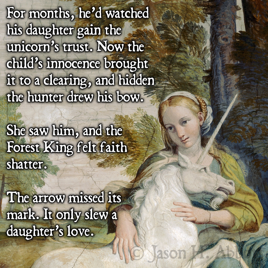 For months, he’d watched his daughter gain the unicorn’s trust. Now the child’s innocence brought it to a clearing, and hidden the hunter drew his bow.