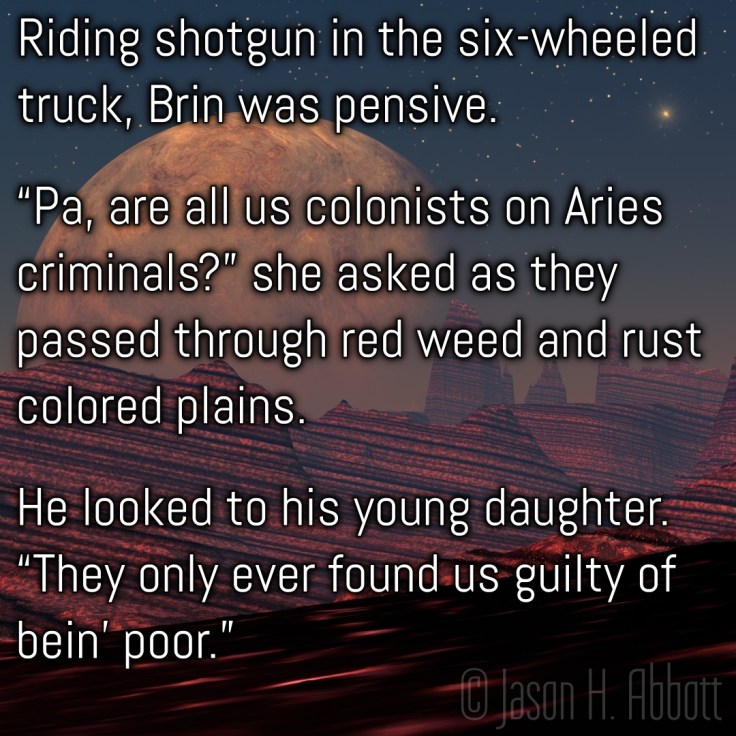 “Pa, are all us colonists on Aries criminals?” she asked as they passed through red weed and rust colored plains.