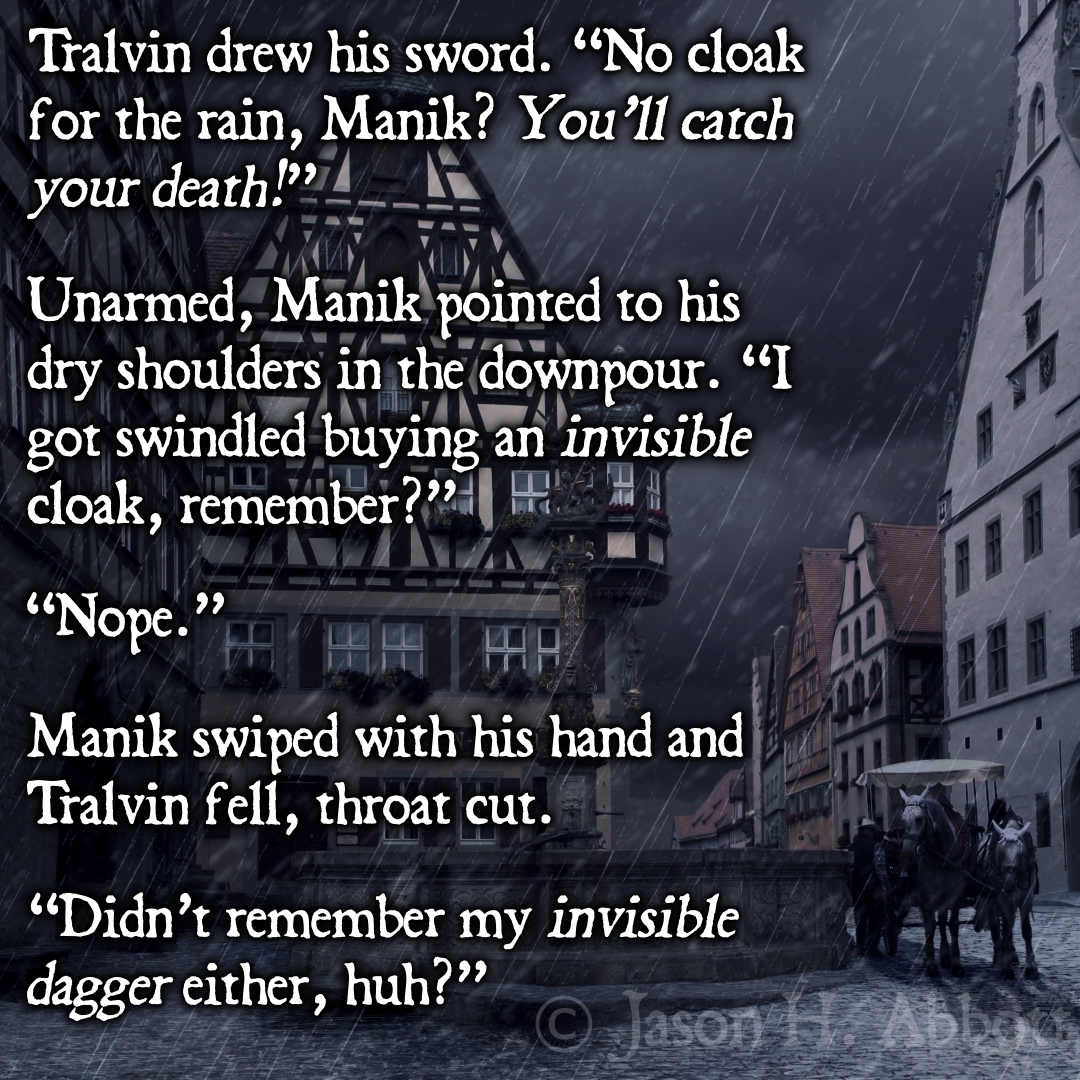 Tralvin drew his sword. “No cloak for the rain, Manik? You’ll catch your death!”