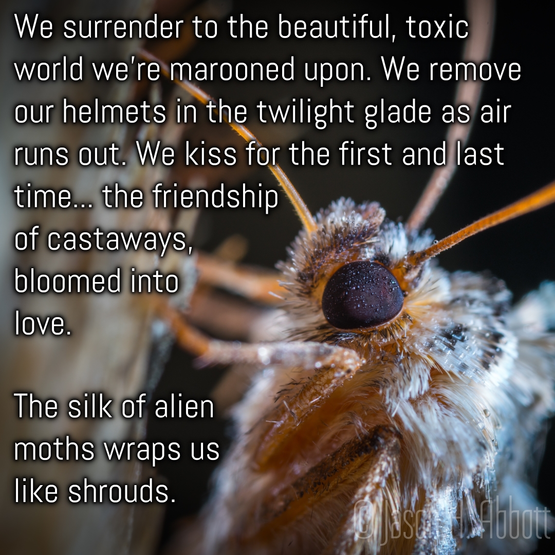 We surrender to the beautiful, toxic world we’re marooned upon. We remove our helmets in the twilight glade as air runs out. We kiss for the first and last time… the friendship of castaways bloomed into love.