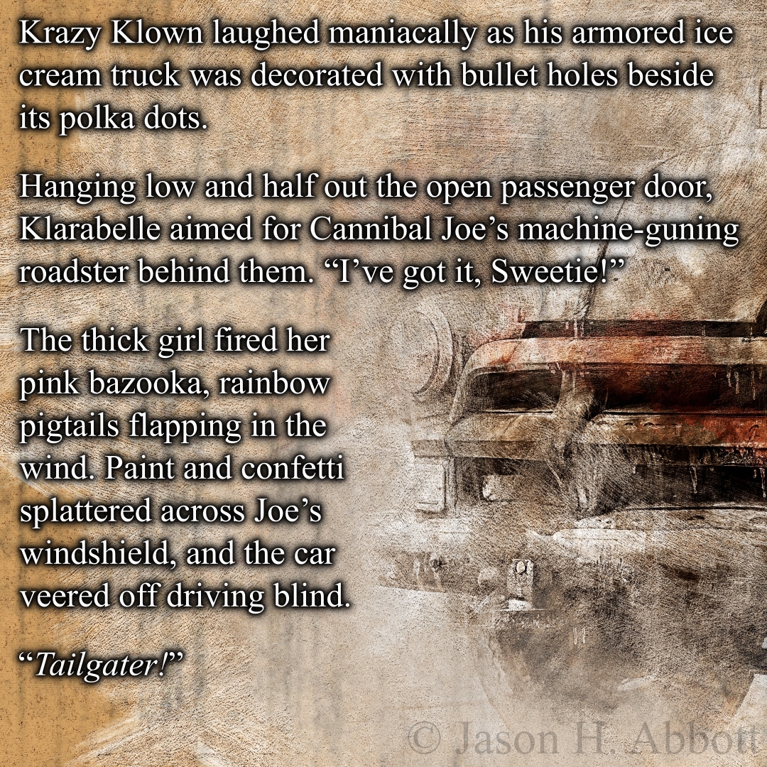 Hanging low and half out the open passenger door, Klarabelle aimed for Cannibal Joe’s machine-guning roadster behind them. “I’ve got it, Sweetie!”