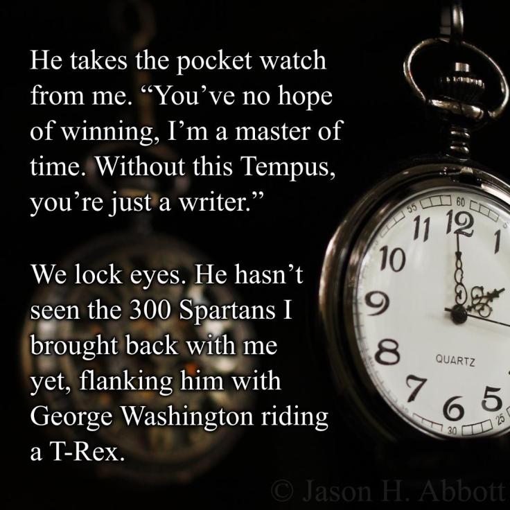 He takes the pocket watch from me. “You’ve no hope of winning, I’m a master of time. Without this Tempus, you’re just a writer.”