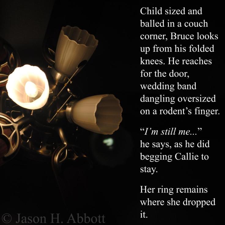Child sized and balled in a couch corner, Bruce looks up from his folded knees. He reaches for the door, wedding band dangling oversized on a rodent’s finger.