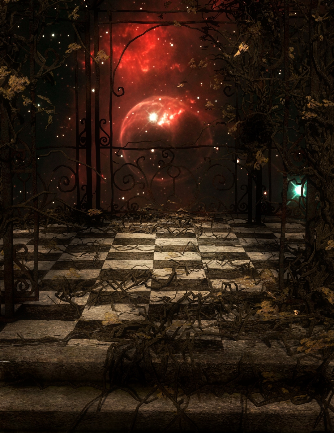 5. I wanted to show her my world. Though a child, she was the only one I could trust. She nodded, so I clicked my fingers and everything went dark. She gasped, then starlight appeared all around. Her eyes went wide when a chess floor showed itself from underneath. Withered vines hung from the iron rails of a gazebo. She moved to touch them and smiled. In the distance, a blood moon and a distant star peeked through the galactic clouds. Her next words struck me: “Can I stay here forever?” How could I tell her she would never survive here?