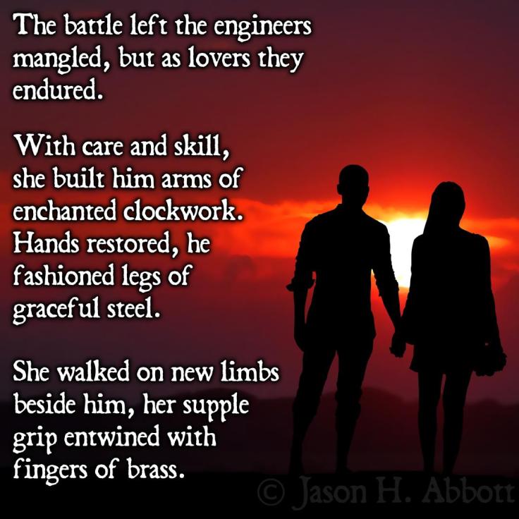 She walked on new limbs beside him, her supple grip entwined with fingers of brass.