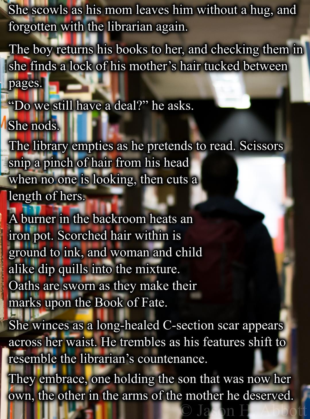 She winces as a long-healed C-section scar appears across her waist. He trembles as his features shift to resemble the librarian’s countenance.