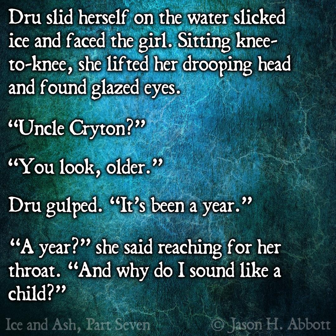 Dru slid herself on the water slicked ice and faced the girl. Sitting knee-to-knee, she lifted her drooping head and found glazed eyes.