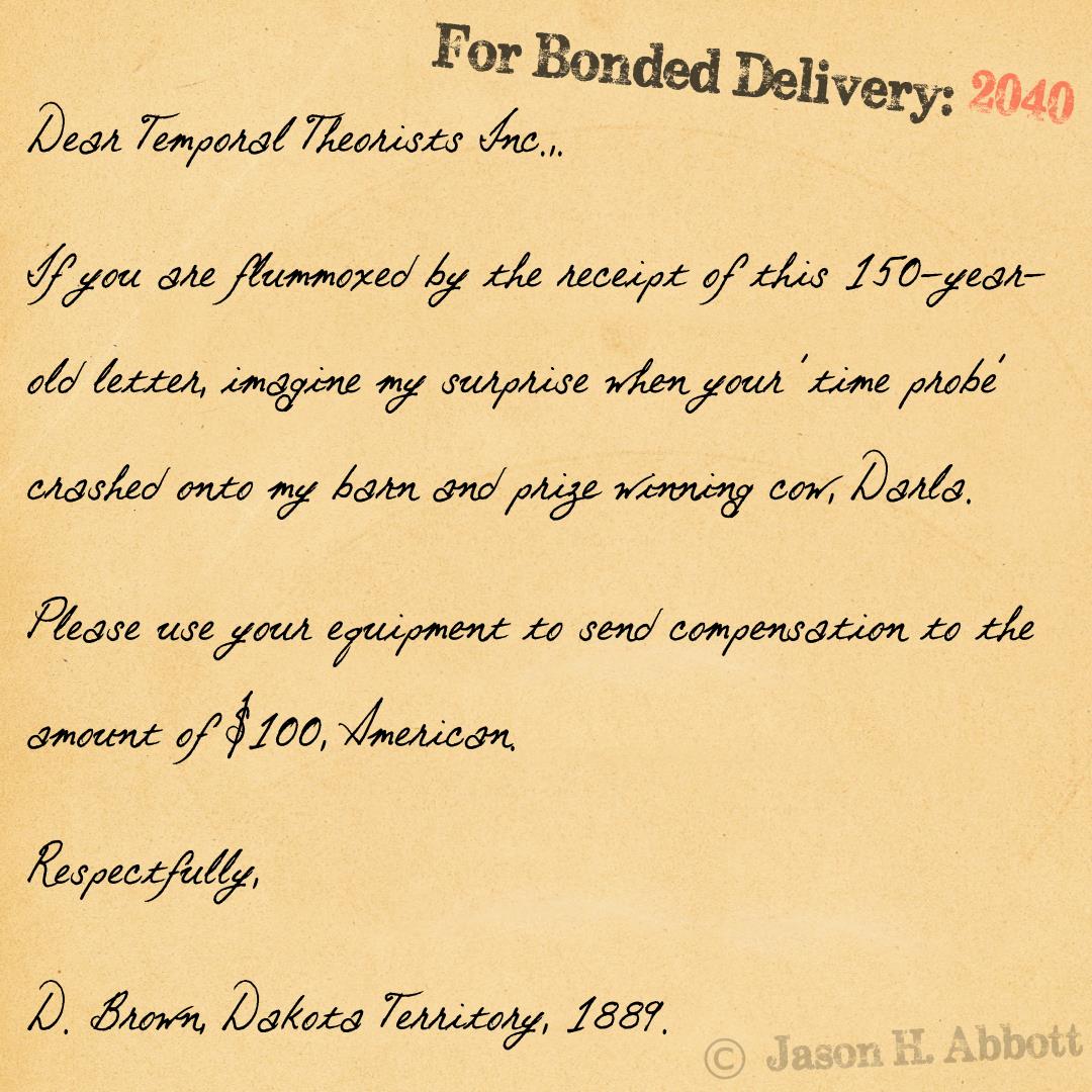 If you are flummoxed by the receipt of this 150-year-old letter, imagine my surprise when your “time probe” crashed onto my barn and prize winning cow, Darla.