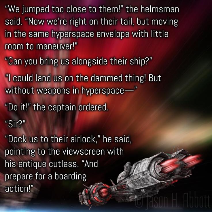 “We jumped too close to them!” the helmsman said. “Now we’re right on their tail, but moving in the same hyperspace envelope with little room to maneuver!”