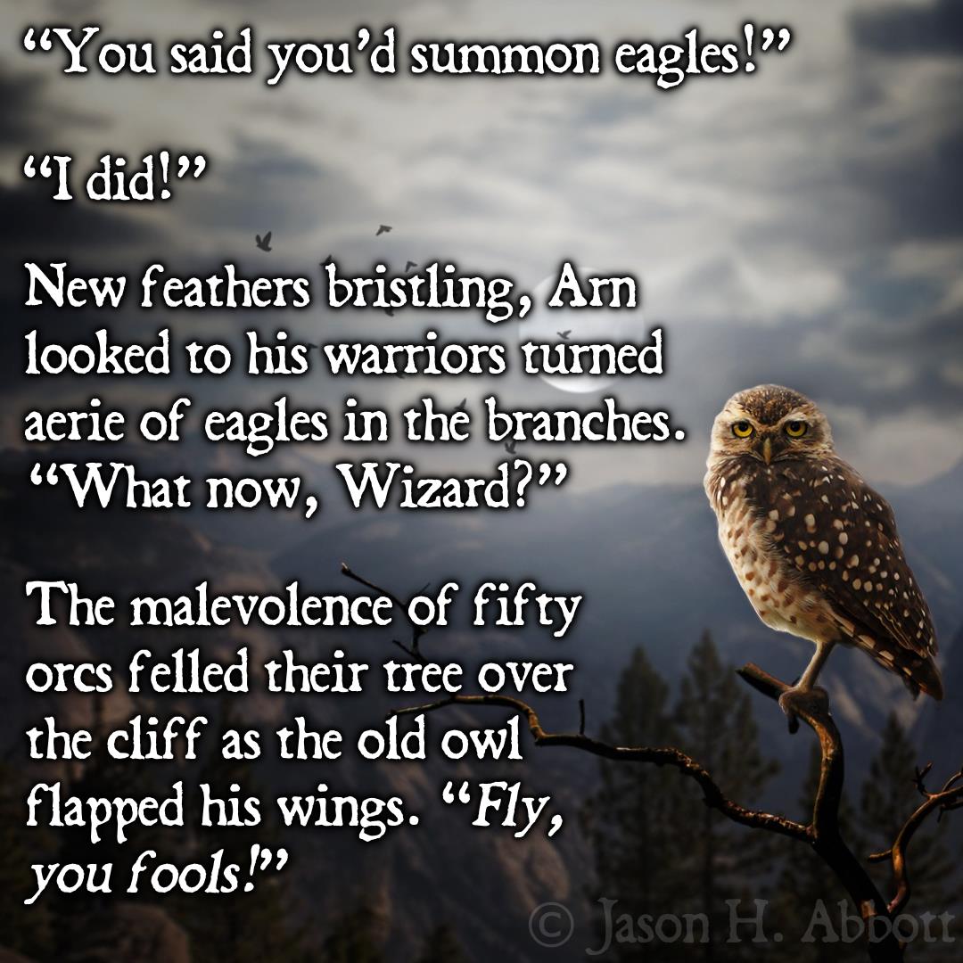 The malevolence of fifty orcs felled their tree over the cliff as the old owl flapped his wings. “Fly, you fools!”