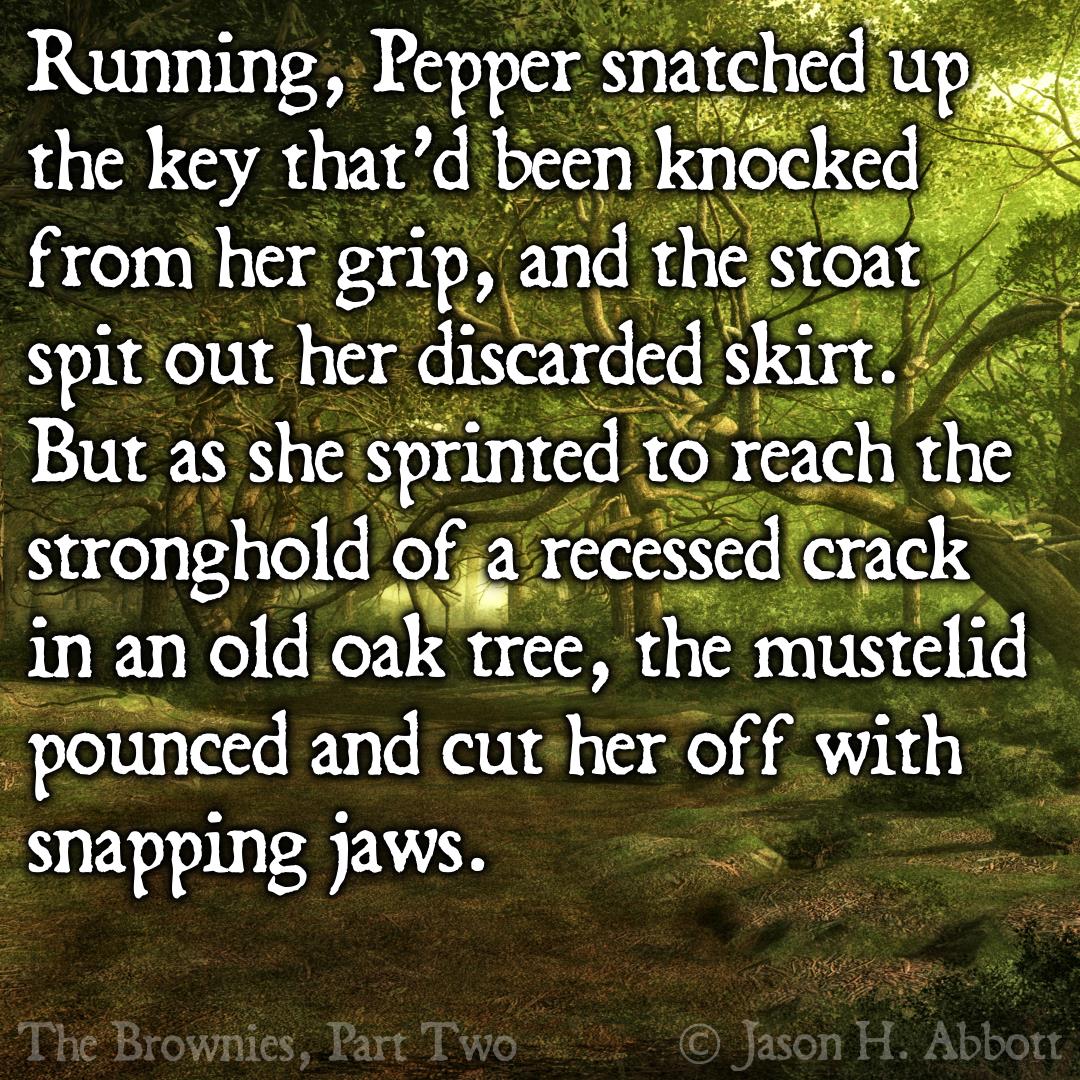 Running, Pepper snatched up the key that’d been knocked from her grip, and the stoat spit out her discarded skirt. But as she sprinted to reach the stronghold of a recessed crack in an old oak tree, the mustelid pounced and cut her off with snapping jaws.