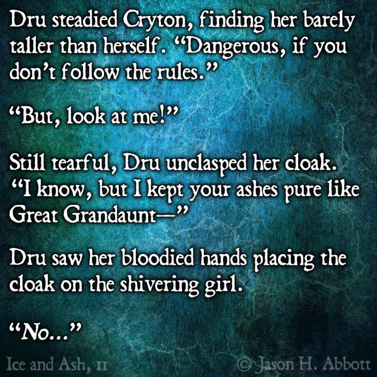 Still tearful, Dru unclasped her cloak. “I know, but I kept your ashes pure like Great Grandaunt—”
