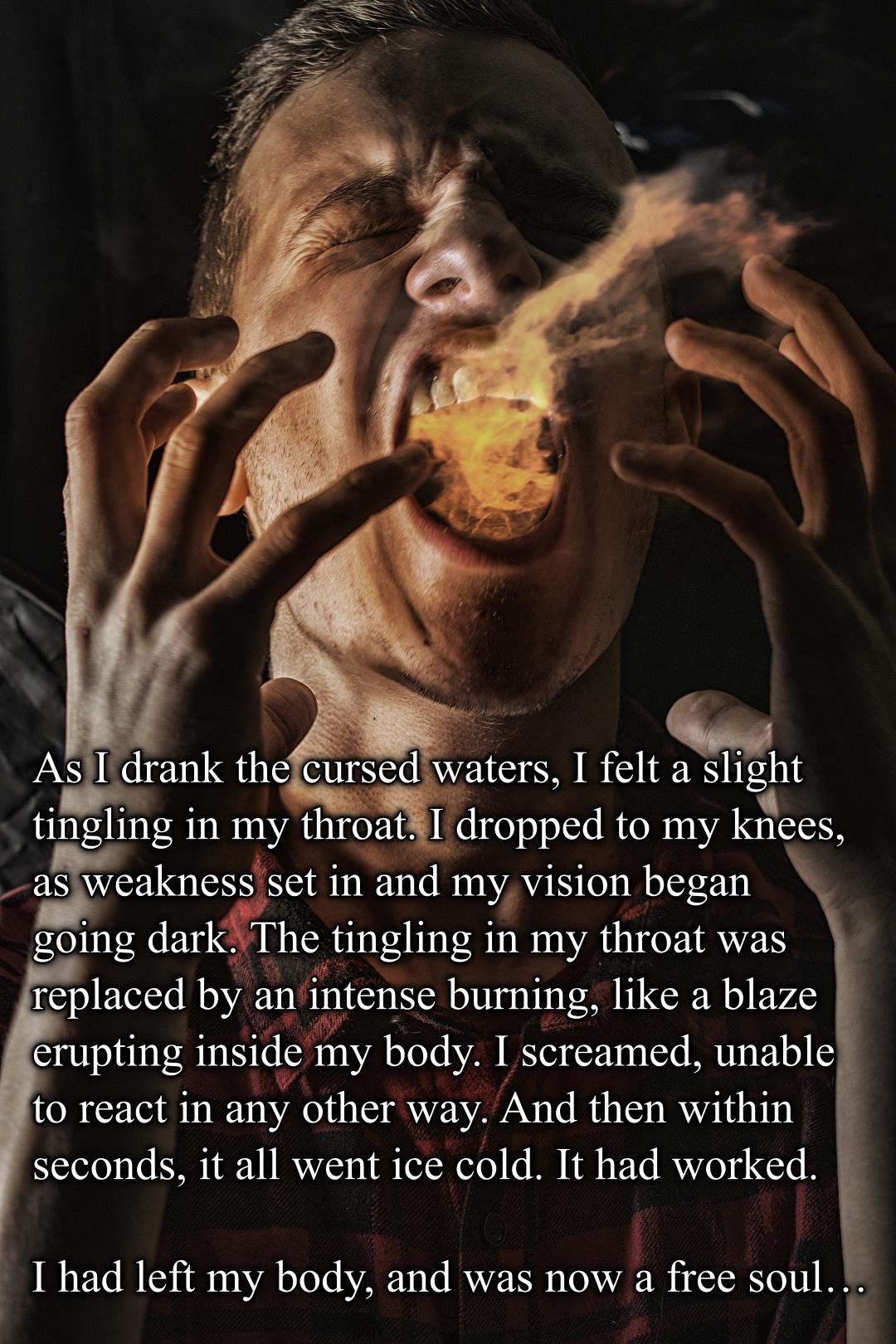 As I drank the cursed waters, I felt a slight tingling in my throat. I dropped to my knees, as weakness set in and my vision began going dark. The tingling in my throat was replaced by an intense burning, like a blaze erupting inside my body. I screamed, unable to react in any other way. And then within seconds, it all went ice cold. It had worked.