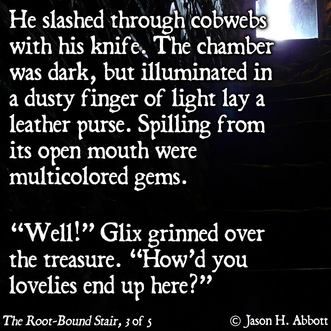 He slashed through cobwebs with his knife. The chamber was dark, but illuminated in a dusty finger of light lay a leather purse. Spilling from its open mouth were multicolored gems.