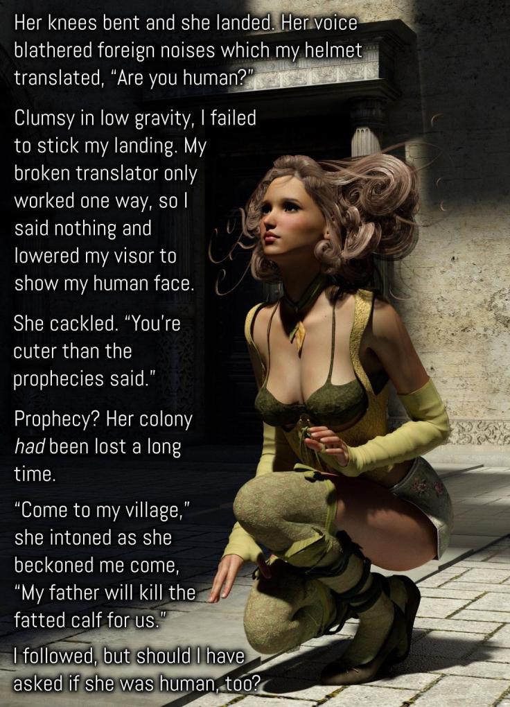 Her knees bent and she landed. Her voice blathered foreign noises which my helmet translated, “Are you human?”