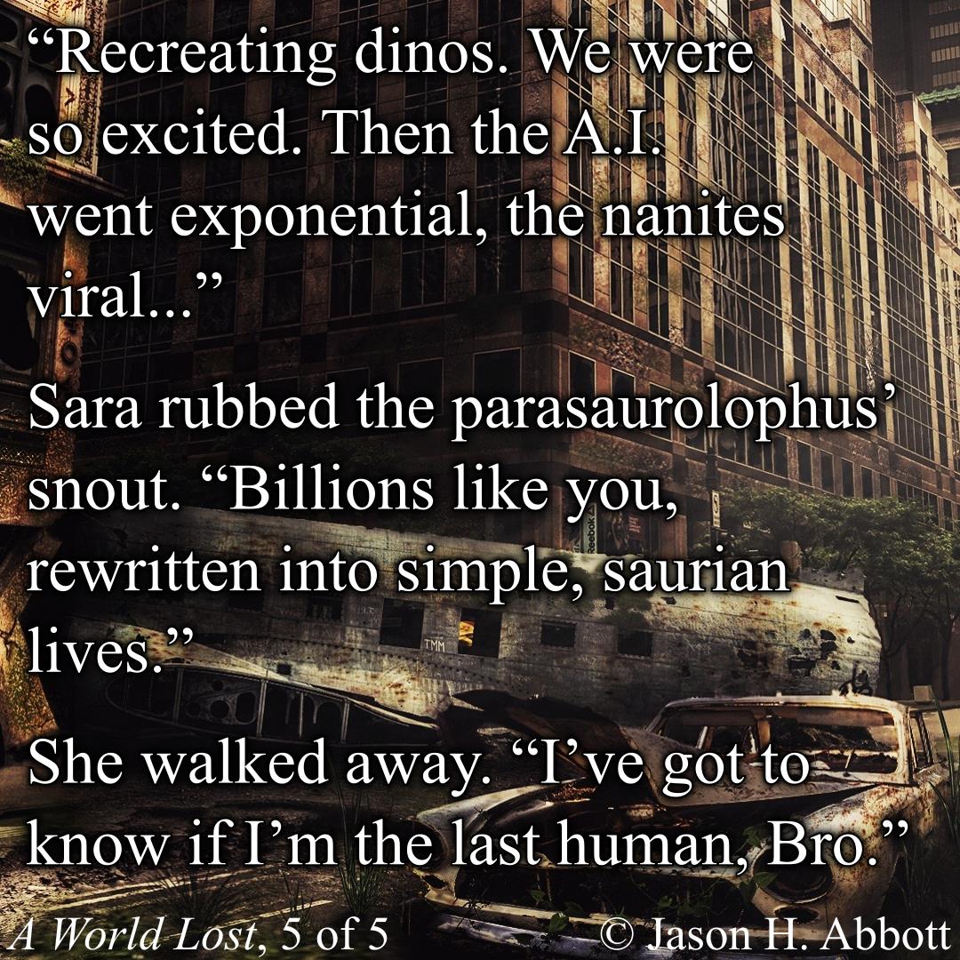 “Recreating dinos. We were so excited. Then the A.I. went exponential, the nanites viral…”