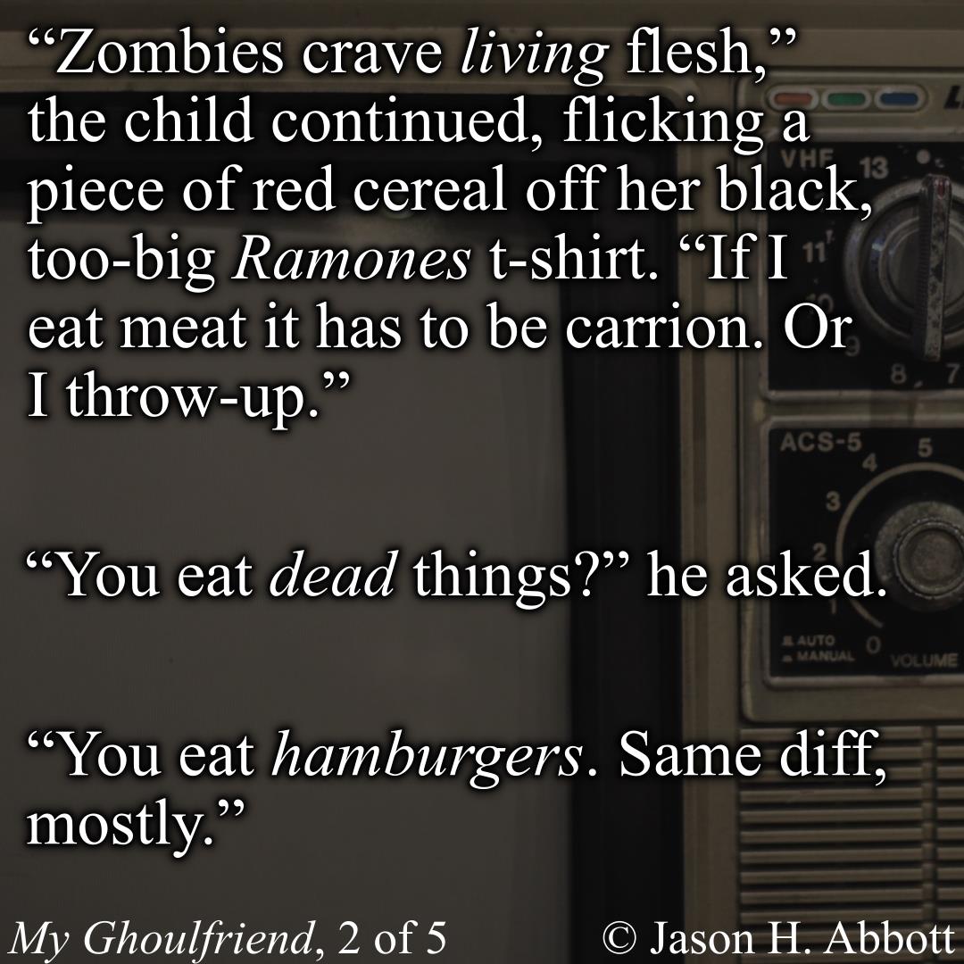 “Zombies crave living flesh,” the child continued, flicking a piece of red cereal off her black, too-big Ramones t-shirt. “If I eat meat it has to be carrion. Or I throw-up.”