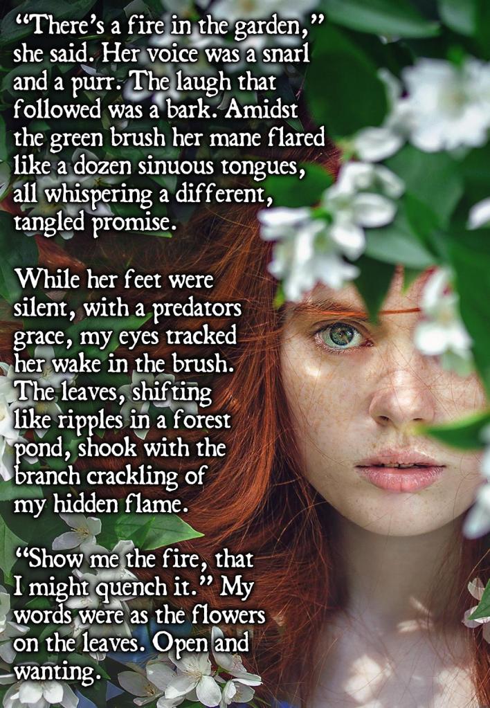 “There’s a fire in the garden,” she said. Her voice was a snarl and a purr. The laugh that followed was a bark. Amidst the green brush her mane flared like a dozen sinuous tongues, all whispering a different, tangled promise.