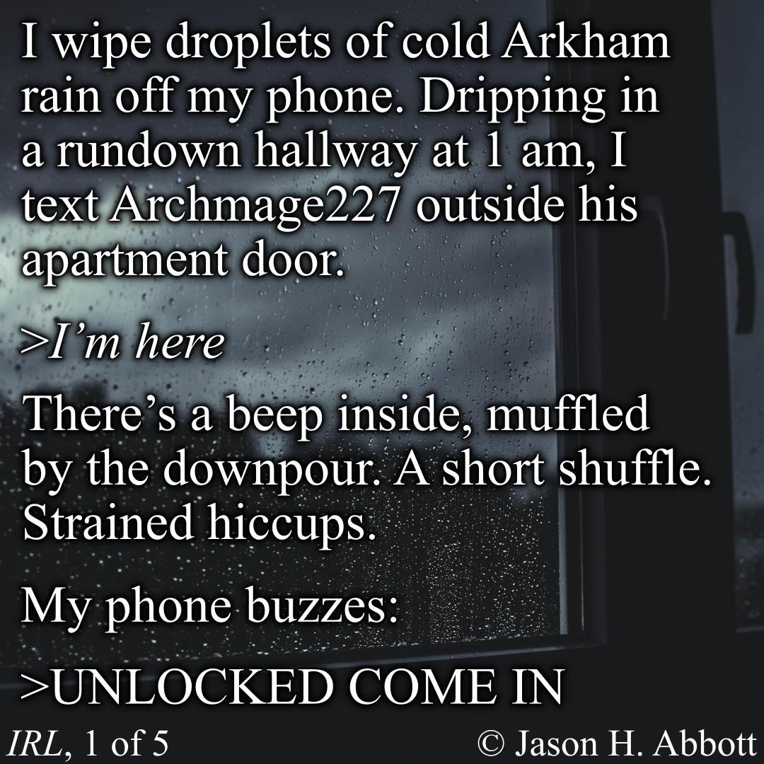 I wipe droplets of cold Arkham rain off my phone. Dripping in a rundown hallway at 1 am, I text Archmage227 outside his apartment door.